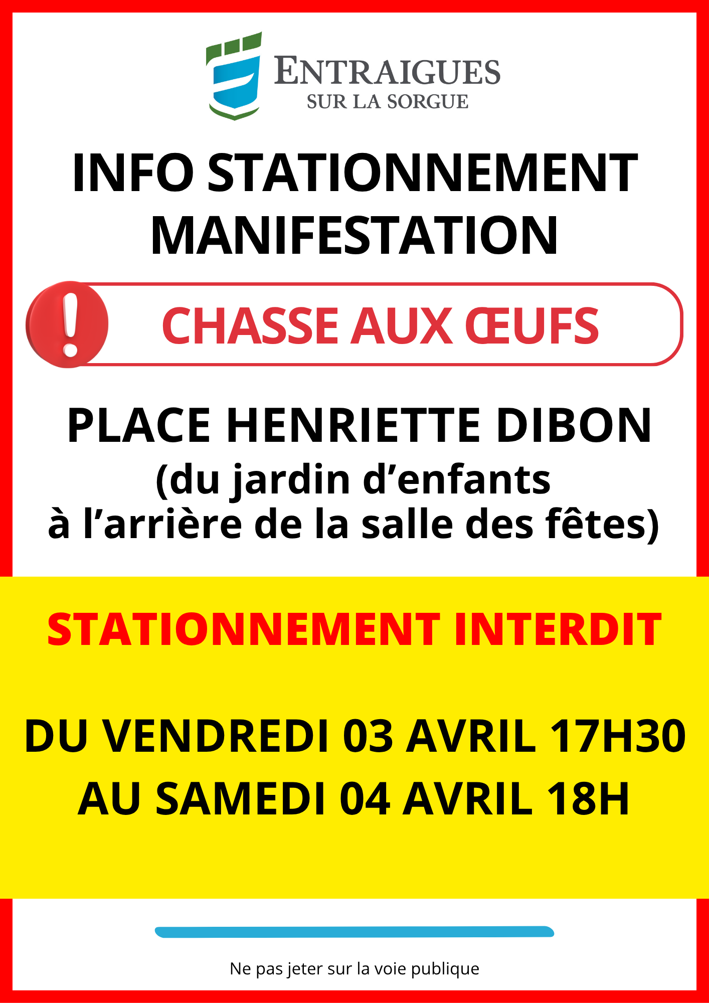 Dans le cadre de la Chasse aux œufs de ce samedi 04 avril, la circulation et le stationnement seront interdits du vendredi 03 avril 17h30 au samedi 04 avril 18h sur une partie de la Place Henriette Dibon (parking de la salle des fêtes).