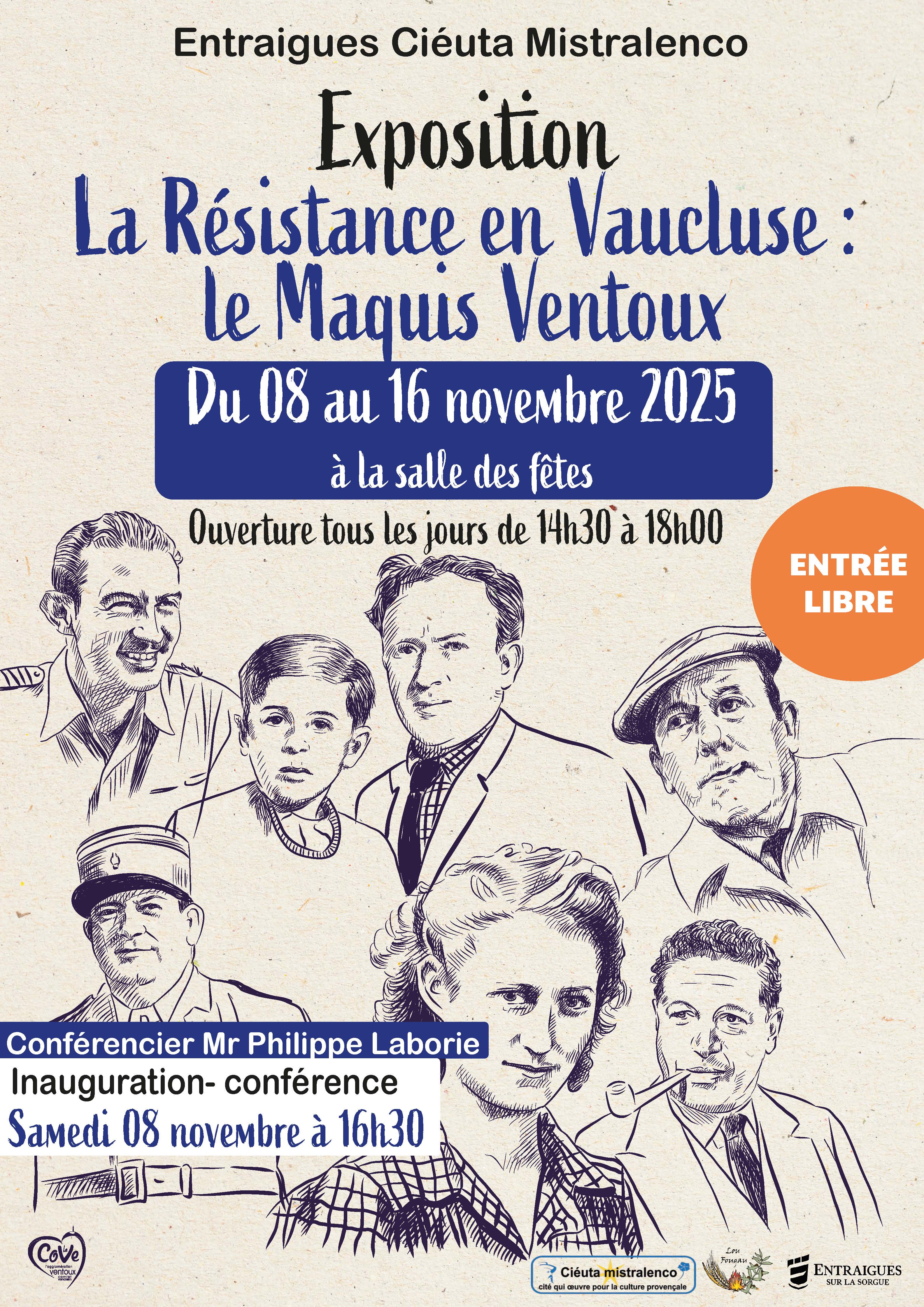 L’association Lou Fougau organise avec la municipalité une exposition sur La Résistance en Vaucluse : le Maquis Ventoux du samedi 08 novembre au dimanche 16 novembre, tous les jours de 14h30 à 18h00 à la salle des fêtes.