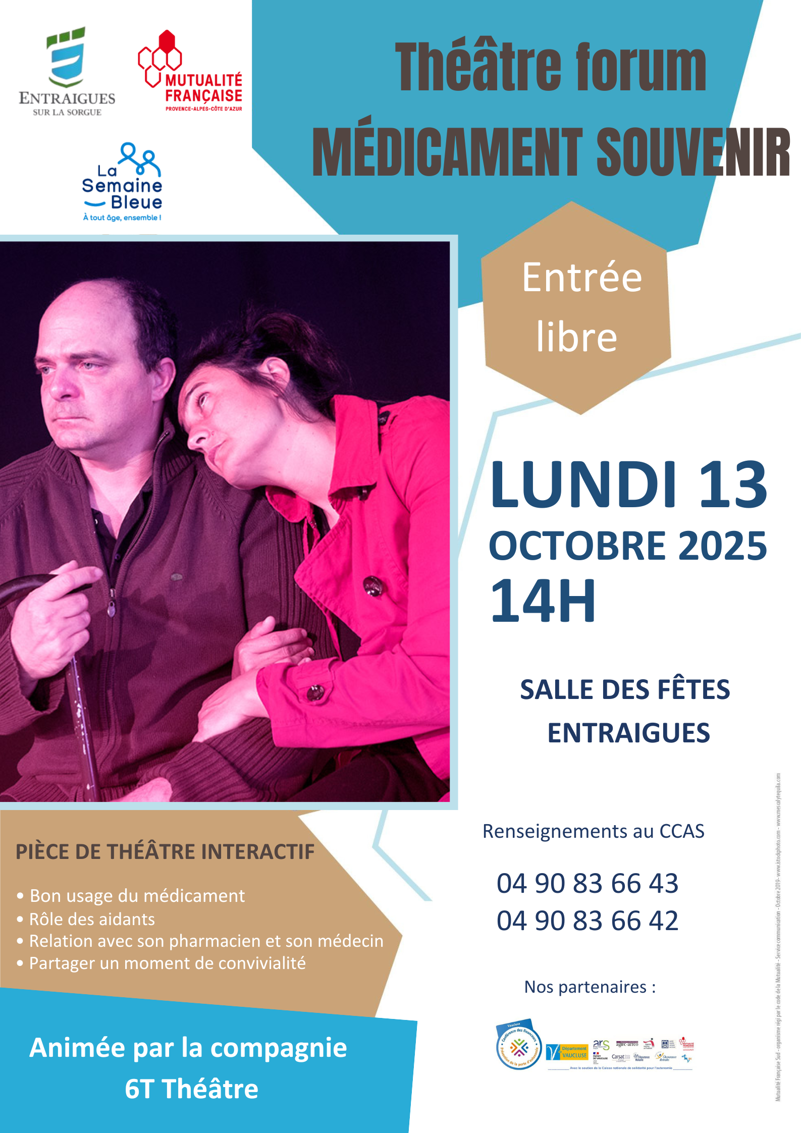 Le lundi 13 octobre à 14h, retrouvez une pièce de théâtre sur le bon usage du médicament, le rôle des aidants et la relation avec son pharmacien et son médecin, le tout dans une ambiance conviviale et décontractée.