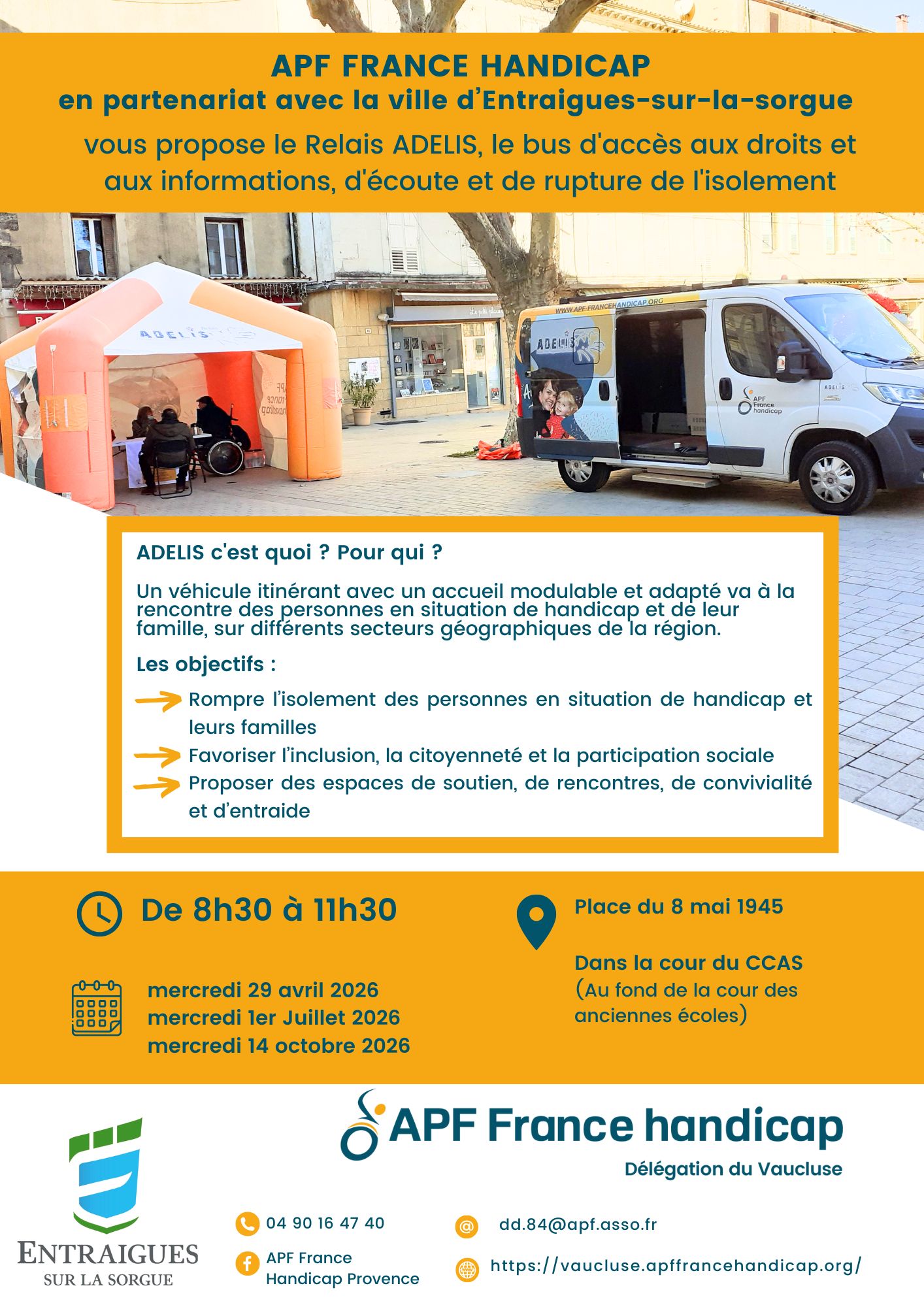 Le Relais ADELIS, soutien itinérant pour les personnes en situation de handicap, sera présent le mercredi 29 avril de 8h30 à 11h30 dans la Cour des Anciennes Ecoles, devant le CCAS.