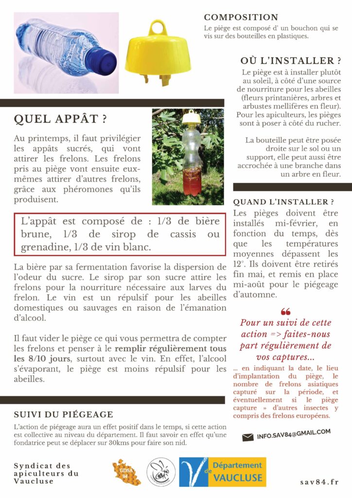 Si vous souhaitez participer et vous pré-inscrire : envoyez-nous un mail à communication@mairie-entraigues.fr ! Les pièges distribués l’an passé restent fonctionnels. Ils doivent être réutilisés et positionnés dès à présent !